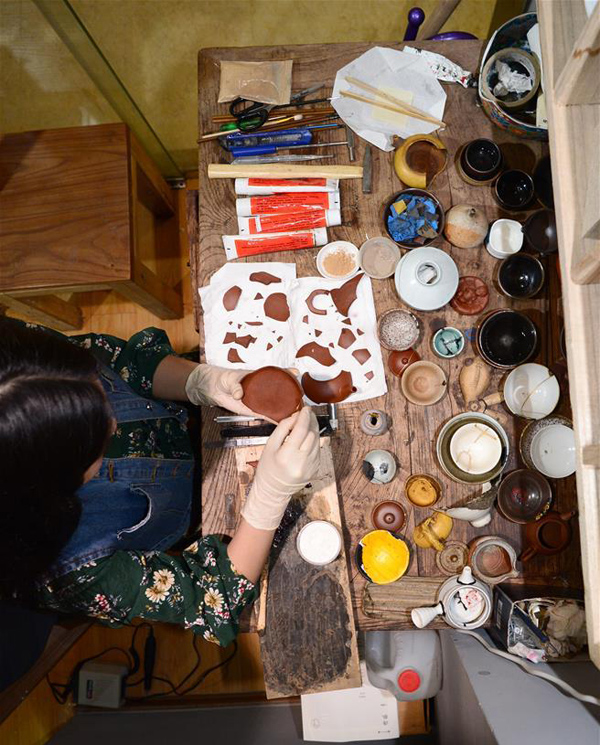 黃俊玲在店鋪內(nèi)進(jìn)行金繕修復(fù)(5月5日攝)。新華社記者 邵瑞攝