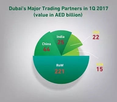 中國繼續(xù)保持迪拜最大貿易合作伙伴地位,貿易額441.5億迪拉姆,占迪拜總對外貿易額13.5%;印度以254億迪拉姆緊隨其后,占7.8%;美國以220億迪拉姆(占6.7%)位居第三。