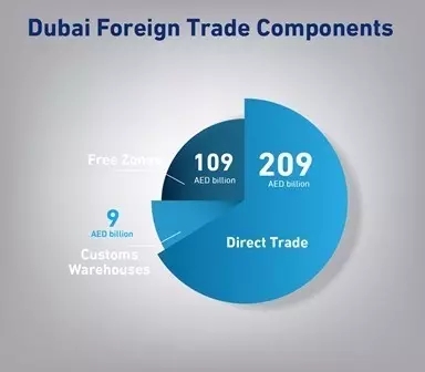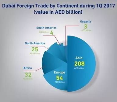 從地區(qū)分布來看,亞洲依舊是迪拜最大的貿易市場,一季度貿易額2080迪拉姆;歐洲和北美洲分列二、三位,貿易額分別為540億迪拉姆和250億迪拉姆;南美洲40億迪拉姆,大洋洲30億迪拉姆。
