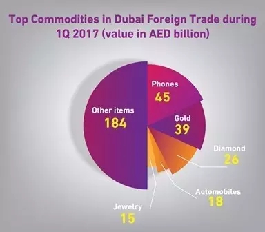 手機依舊是迪拜第一季度最大額貿易商品,貿易額450億迪拉姆(占總額14%);黃金和珠寶分列二、三位,貿易額分別為390億和260億迪拉姆;汽車產品貿易額180億迪拉姆,珠寶150億迪拉姆。