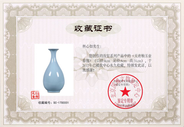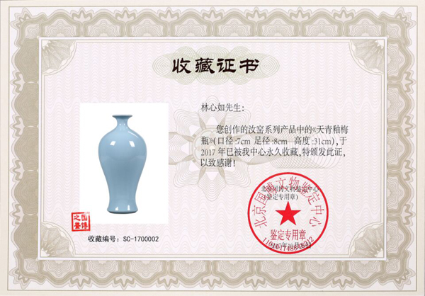 作品《天青釉梅瓶》收藏證書