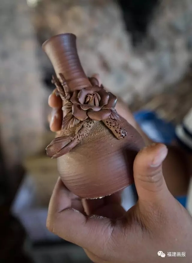 洞上陶藝村曉德陶藝坊的主人是“80后”陶藝師李德鵬,17歲初中畢業(yè)后,他進入朋友的陶瓷廠當?shù)袼軐W徒。之后為了謀生,他轉行做起了鏟車司機,中斷了與陶瓷的緣分。直到三年前,看著三班鎮(zhèn)陶瓷行業(yè)發(fā)展迅速,他毅然決定回到家鄉(xiāng)與妻子開辦了這間陶藝坊,重拾自己最擅長的手拉坯雕刻。經(jīng)營陶藝坊一年多以來,李德鵬不僅提高了收入,也激發(fā)了創(chuàng)作靈感。
