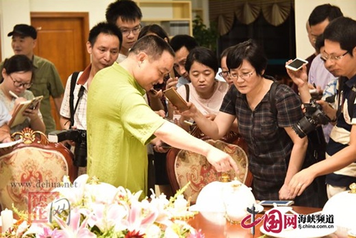 中國網(wǎng)泉州訊(記者 胡光華 文圖)“哈!哈!哈!”9月14日,中國白陶瓷藝術(shù)館藝術(shù)總監(jiān)陳仁海一見到“異彩中國白”新聞采風(fēng)團(tuán)記者們前來,就緊緊握著中共德化縣委常委、宣傳部長陳堅(jiān)宏的手樂不可支地開心大笑,笑得非常爽朗,他的笑聲緣自該館研發(fā)制作的118套《四海同心》系列國宴瓷,成功躋身成為金磚國家領(lǐng)導(dǎo)人廈門會晤國宴餐具。