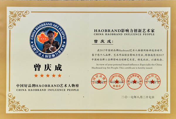 近日,由好品牌網(wǎng)、西北品牌營銷聯(lián)盟、生產(chǎn)力學(xué)會策劃專家委員會、亞太好品牌實(shí)驗(yàn)室、民營企業(yè)發(fā)展戰(zhàn)略研究院、百城聯(lián)盟文化產(chǎn)業(yè)聯(lián)合會、華人頻道、全球好書畫網(wǎng)、等機(jī)構(gòu)聯(lián)合主辦中國好品牌藝術(shù)人物網(wǎng)絡(luò)評選活動(Haobrand藝術(shù)人物排行榜)在本次的評選活動中,根據(jù)曾慶成個人品牌、藝術(shù)作品綜合影響力突出等,被評選為2017年中國好品牌品牌影響力創(chuàng)新藝術(shù)家。