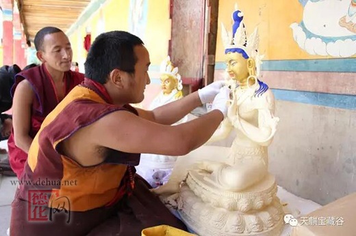 ▲扎什倫布寺文管會(huì)僧眾為瓷佛貼金