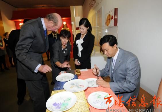 肯特公爵(左)、呂峰(右)在英國做刻瓷表演,受到英國肯特公爵的接見并參觀贊揚!