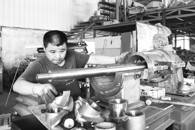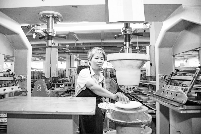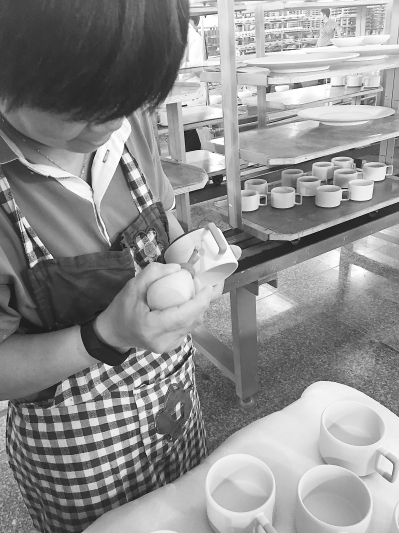 陶瓷生產(chǎn)許多工序還需要手工操作,圖為工人在手工上釉。
