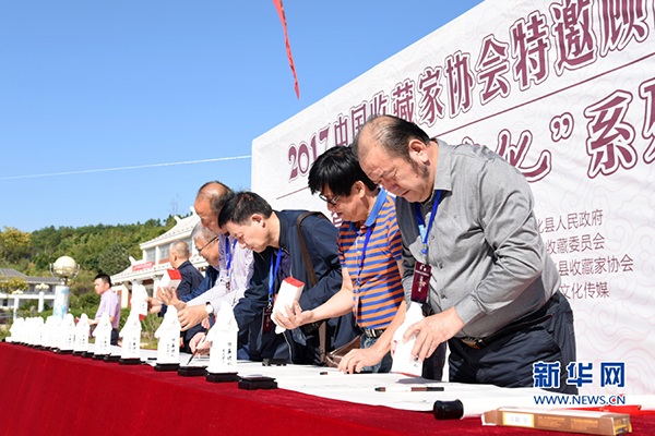 開幕式上,中國收藏家協(xié)會特邀顧問簽名。(新華網(wǎng)發(fā)許華森攝)
