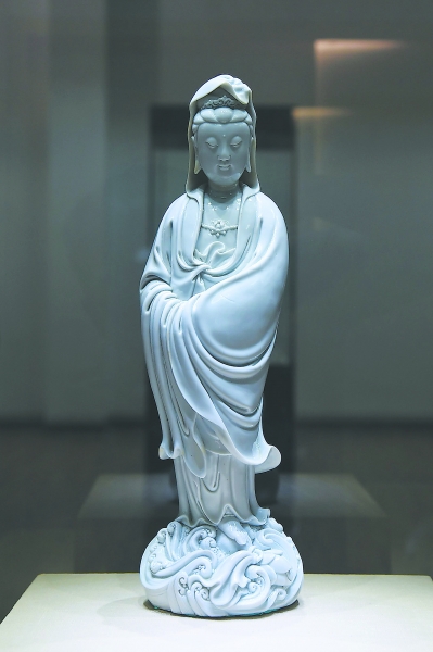 在德化縣陶瓷博物館展廳,一尊47厘米高的“渡海觀音”(右圖)吸引了無數(shù)目光。它線條流暢,衣紋自然飄逸,通體溫潤如玉,好似一位高雅的“東方女神”,令人嘆為觀止。這尊何朝宗的作品,是收藏者孫義鑫2014年在北京以333萬元拍得。