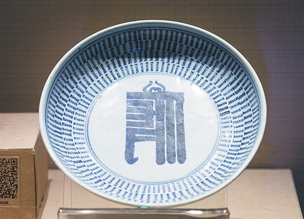 清代青花梵文瓷盤。海南日報(bào)記者 王玉潔 攝