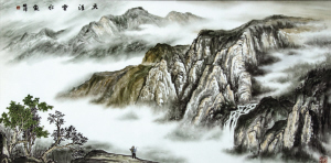 瓷板國畫山水,釉上淺醬彩燒成,用現(xiàn)代筆墨技法表現(xiàn),遠(yuǎn)山近景流泉云煙氣韻生動(dòng)。近景樹木前后關(guān)系對(duì)比合理,人物點(diǎn)景生動(dòng)。畫意表現(xiàn)了作者胸襟廣闊,熱愛自然山水。