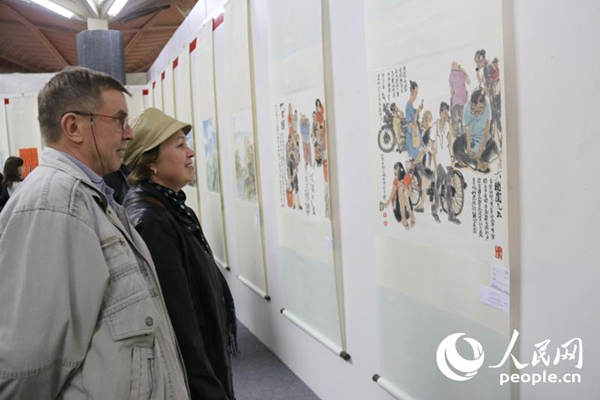 哈薩克斯坦觀眾欣賞中國繪畫(記者周翰博攝)