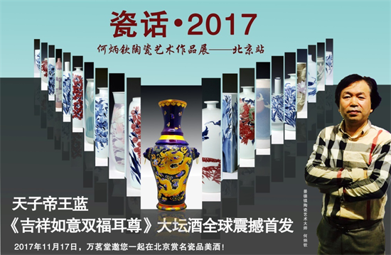 2017年11月17日,由中國陶瓷頻道、宜賓五糧液股份有限公司真龍?zhí)熳泳七\(yùn)營中心主辦;北京萬茗堂承辦,中國陶瓷工業(yè)協(xié)會、中國收藏家協(xié)會陶瓷收藏委員會、景德鎮(zhèn)藝術(shù)陶瓷研究院為指導(dǎo)單位, 北京市國家新媒體產(chǎn)業(yè)基地星光影視園2號樓《中國陶瓷頻道美術(shù)館》舉辦“瓷話·2017何炳欽陶瓷藝術(shù)作品展——暨吉祥如意雙福耳尊全球首發(fā)”活動,現(xiàn)場共展出何炳欽教授各類作品40余件作品。