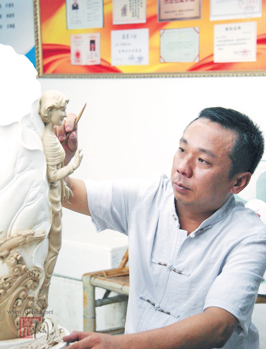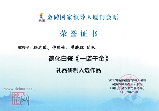 “國(guó)禮一定要有特定的難度,是無(wú)法輕易做到的寶貝級(jí)作品,這樣才顯大國(guó)風(fēng)范,也更能體現(xiàn)創(chuàng)作者的匠心。”徐思敏說(shuō),他以象征承諾、誠(chéng)信的印章為主體,創(chuàng)作了此次國(guó)禮作品《一諾千金》。因作品主題寓意深遠(yuǎn),他的設(shè)計(jì)稿很快從遴選中勝出。然而,真正的困難還在后面。由于作品被設(shè)計(jì)成長(zhǎng)方形,而且體量較大,燒制期間他真正體驗(yàn)了什么叫“十窯九不成”,不少精心雕塑的作品經(jīng)過(guò)燒制后全部失敗作廢,這讓他既痛心又有些氣餒。“作品難度太大,很難完美呈現(xiàn),短時(shí)間內(nèi)沒(méi)辦法完成,我準(zhǔn)備放棄了。”今年春節(jié)期間,他給德化縣委宣傳部長(zhǎng)陳堅(jiān)宏打電話時(shí)說(shuō)道。第二天,陳堅(jiān)宏來(lái)到他家中,與他促膝長(zhǎng)談,鼓勵(lì)他迎難而上。此后,他重整創(chuàng)作思路,并暗下決心,一定要攻克難題。于是,他立即組織團(tuán)隊(duì),放棄休假時(shí)間開(kāi)始加班,共同研究作品的成型問(wèn)題。