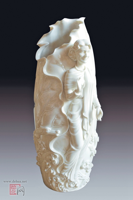 在公司展廳內(nèi),記者見(jiàn)到《明·渡海觀音》《明·披坐觀音》《白釉文昌帝君》等作品。“這些都是國(guó)寶復(fù)原作品”,他說(shuō),從2011年開(kāi)始,他開(kāi)始帶領(lǐng)團(tuán)隊(duì)實(shí)施“中國(guó)風(fēng)·瓷計(jì)劃”項(xiàng)目,復(fù)制德化陶瓷博物館內(nèi)的作品,將德化窯優(yōu)良技藝再現(xiàn),并融合一些現(xiàn)代的創(chuàng)作理念,讓其成為新的文創(chuàng)產(chǎn)業(yè)。他說(shuō),推行“陶瓷+”模式,已成功打造“國(guó)寶復(fù)原·德化窯”“螭龍尊——大師瓷酒之道”“大師佛瓷之道”等工程。