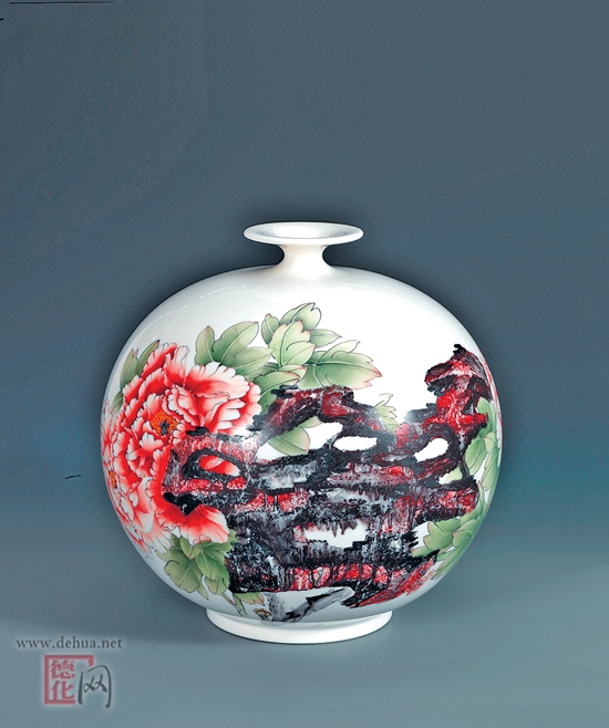 “牡丹是中國的國花,有富貴吉祥的美好寓意。”談起創(chuàng)作國禮《富貴五!返臉(gòu)思,曾映雪說,整件作品以球體為主體,利用陶瓷瓶天方地圓的造型,使用五朵“不分彼此,不分大小”的牡丹花環(huán)繞球瓶一周,讓人站在任何一個(gè)角度看,都是一個(gè)完整的畫面,象征“和諧共融,互惠互利”。值得一提的是,這件在裝飾手法上首創(chuàng)釉上高溫裝飾,是一次創(chuàng)新和突破,也是國禮中唯一一件陶瓷繪畫作品。