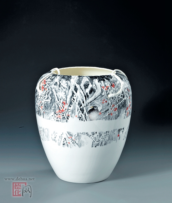 她視瓷胎如紙絹、釉料如水墨,在陶瓷罐器皿上描繪各種花果蟲魚、飛禽走獸、山川林木以及樓亭人物。她一邊教學(xué)一邊創(chuàng)作,在不斷的實(shí)踐與探索中,形成了構(gòu)思新穎、色調(diào)和諧、繁簡有度、技巧嫻熟、筆觸凝練、以形寫神、形神兼?zhèn)涞漠嬶L(fēng)特點(diǎn)。裝飾畫細(xì)致華麗,山水畫飄逸淡泊,花鳥畫生機(jī)盎然。尤其人物瓷畫,線條優(yōu)美、細(xì)膩入微,不論是表現(xiàn)文人墨客還是纖纖仕女,都能隨心所欲駕馭各種技法表達(dá)情感,使線條、塊面和色彩的表現(xiàn)都有自己獨(dú)特的個(gè)性和特點(diǎn)。