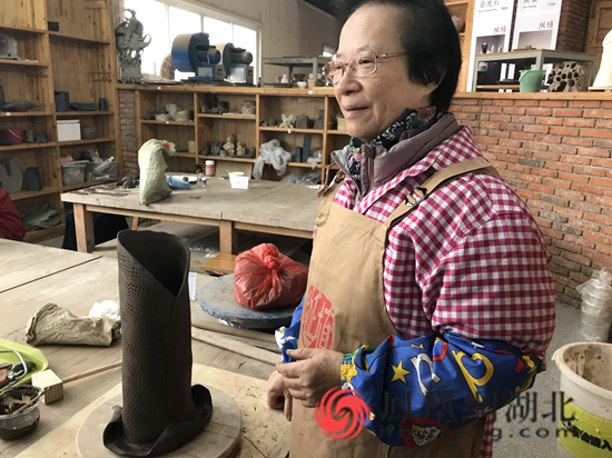 “現在年紀大了嘛,只能用盤條的形式做陶藝了。”今年70歲的黃美莉老師來自中國香港特別行政區(qū),做采訪時她正在創(chuàng)作手中的泥板卷桶,大塊的陶土對于現在的黃老師老說體力上有點吃不消,才用盤條的方式會相對輕松一些,“年輕的時候我住在英國,隔壁鄰居是一位藝術家,我那時候經常去他們家里玩,之后就跟著他學,后來回到香港,也去了很多地方學,到現在做陶有四十多年了。”黃老師告訴我們,跟武漢的緣分從十二年前就開始了,“十二年期我來武漢教學生們雕塑,這一次來感覺這里發(fā)展的很快,設備、環(huán)境都有了很大的改善。”