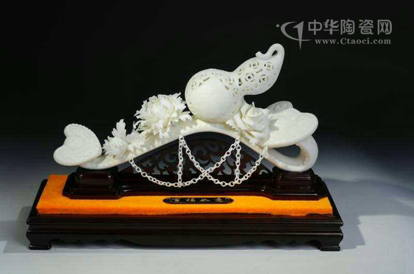 蘇志強(qiáng)的作品《圓滿如意》就是揉合中華傳統(tǒng)文化的元素,以如意棒為主體,圓球代表圓滿,蘊(yùn)含著“萬(wàn)事如意”、“美美滿滿”的美好意象。作品純手工制作,精雕細(xì)刻,造型和諧,用璀璨的瓷花襯托柔軟鏈條的動(dòng)感,剛?cè)嵯酀?jì),松密結(jié)合,令人賞心悅目。作品并以德化特有的溫潤(rùn)如玉的“中國(guó)白”為胎質(zhì),潔白細(xì)膩,素凈淡雅。