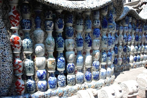 瓷房子所用瓷器和瓷片年代從漢代一直跨越到清代,窯址除五大名窯外還有龍泉窯、耀州窯等,中國(guó)所有官窯、民窯瓷的種類幾乎都可以在這里看到。瓷房子不僅用了大量的瓷片,還用了好多現(xiàn)成的瓷器,看看眼前巨大的瓷瓶,內(nèi)行人能看出是哪個(gè)朝代的嗎?