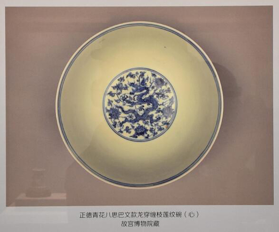 該部分展柜背景圖所展示的正德青花八思巴文款龍穿纏枝蓮紋碗(心)圖