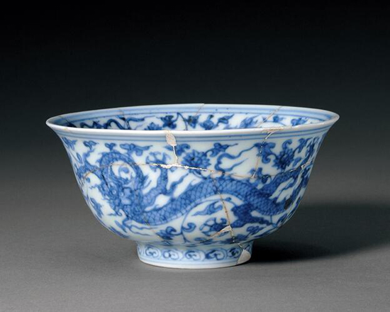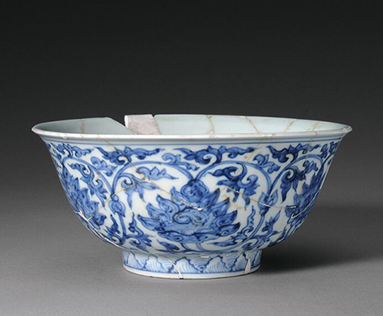 此碗沿用明代前期龍穿纏枝蓮紋碗的造型和紋飾,雙鉤紋飾線條流暢,填色細(xì)致,青花發(fā)色純正,局部出現(xiàn)鐵銹斑,體現(xiàn)出正德朝御用青花瓷器造型穩(wěn)重、紋飾精美的風(fēng)貌。