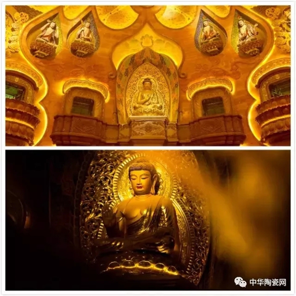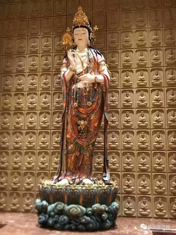 燒制完成之后,還要由莆田工藝大師吳立波進行彩繪和鑲嵌,包括表面巖彩金線鑲嵌,瓔珞、蓮臺、背光局部巖彩鑲嵌等。