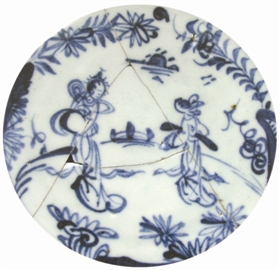 “愿天下有情人終成眷屬”是對(duì)美好愛情的祝愿和憧憬,也是文學(xué)藝術(shù)永恒的主題。此塊明弘治景德鎮(zhèn)民窯青花《西廂記·鶯鶯拜月》(見圖)胎質(zhì)細(xì)白、青花濃重?zé)o散暈、釉光潤略閃青色,內(nèi)底心薄下塌,外足墻斜削,盤面雙藍(lán)圈內(nèi)徑12.3厘米。瓷畫運(yùn)用傳統(tǒng)中國畫寫意畫技法,通過灑脫豪放的筆觸,氣韻清逸地描繪著崔鶯鶯拜月祈求美好愛情的傳奇故事。