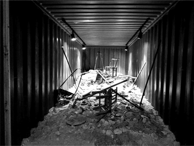 一個集裝箱,內(nèi)有一方土堆,各式制瓷工具無規(guī)則擺開,原始、粗糙與凌亂……