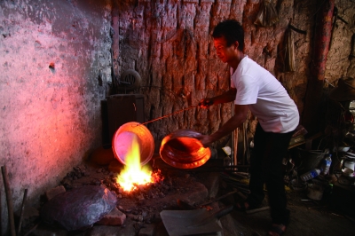 江川制銅業(yè)歷史悠久,新河嘴村和漁村打制銅器的歷史可追溯到600年前。出于生活的需要,村民以黃銅、紫銅為原料,鍛打炊鍋、臉盆、茶盤、茶壺及碗筷等生活用具。隨著時代的變遷,加之種種歷史原因,這一民間工藝一度斷層多年,到上世紀九十年代初,整個江川僅有幾名藝人打制炊鍋、臉盆、茶盤、茶壺、墨盒、碗筷湯匙等器皿,且多為自用或供親朋好友使用。1993年后,由于市場需求的擴大,江川青銅文化開始在民間慢慢復蘇。
