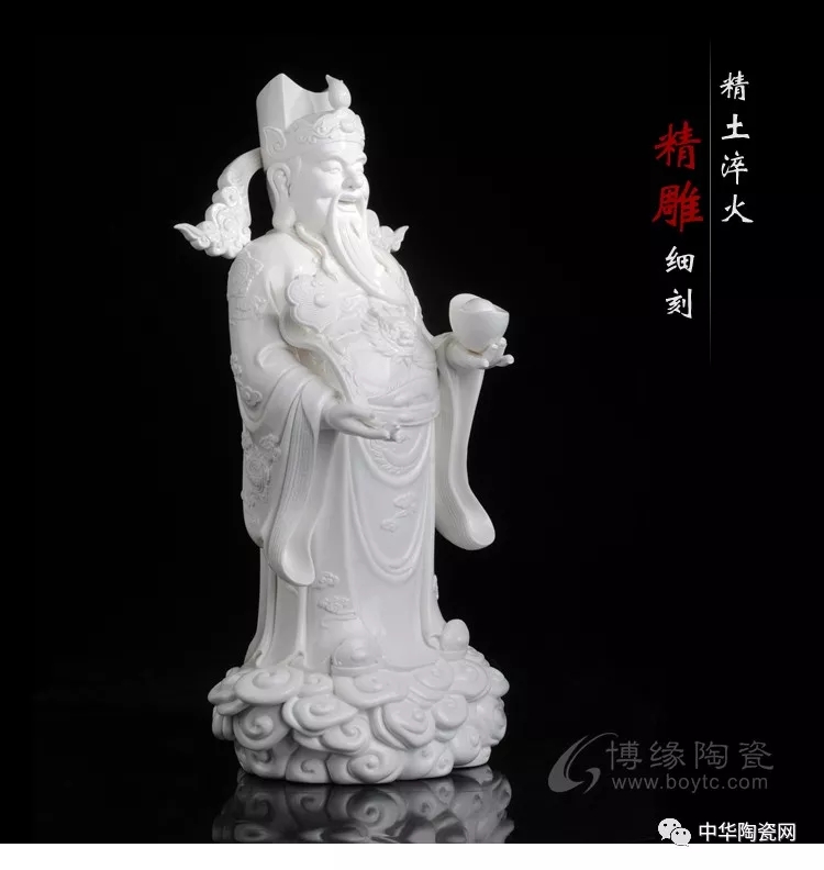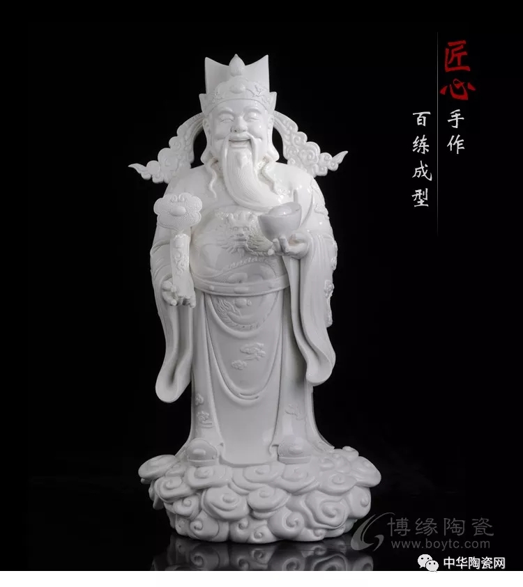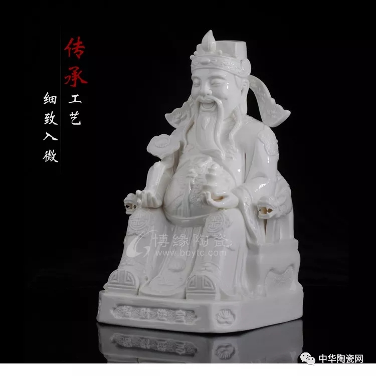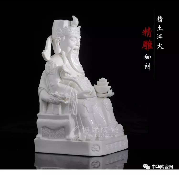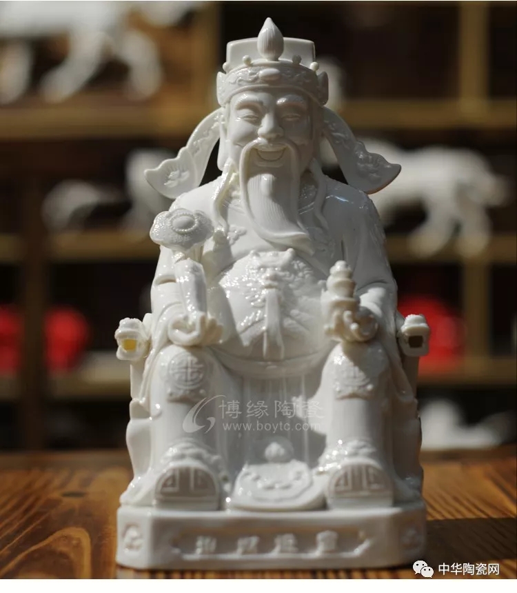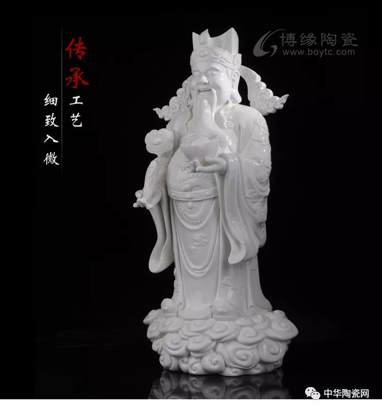 財神佛像是德化窯瓷塑藝術(shù)的常見題材之一。德化瓷塑在中國陶瓷史上久負盛名,它用優(yōu)質(zhì)的白瓷塑造神態(tài)各異的人物,以純凈瑩潤的釉色和生動傳神的形象取勝,摒棄彩繪而追求單純的雕塑美和原材料的質(zhì)地美,獨具藝術(shù)風韻。