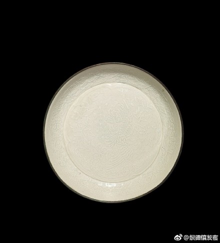 北宋/金 定窯印花盤,臨宇山人舊藏。印花裝飾是定窯白瓷的裝飾技法之一,成熟于北宋中后期,金代更為普及。其做法是將半干的坯體扣在雕刻有圖案的模具上,用手拍打,使花紋印到器物上,然后施釉入窯燒成。整塊模具將紋飾一次拍印完成,操作簡便,易于批量生產(chǎn)。
