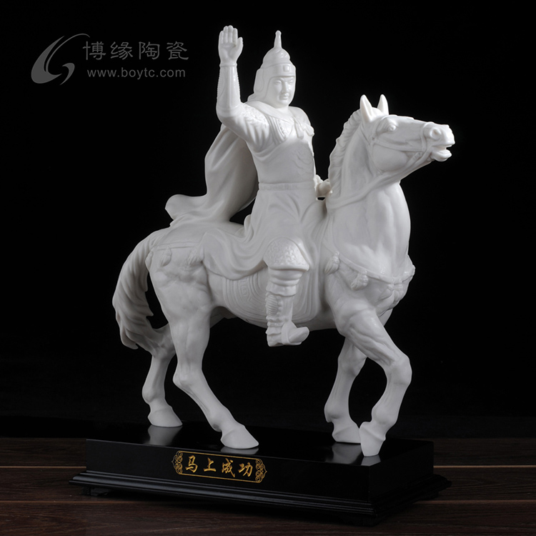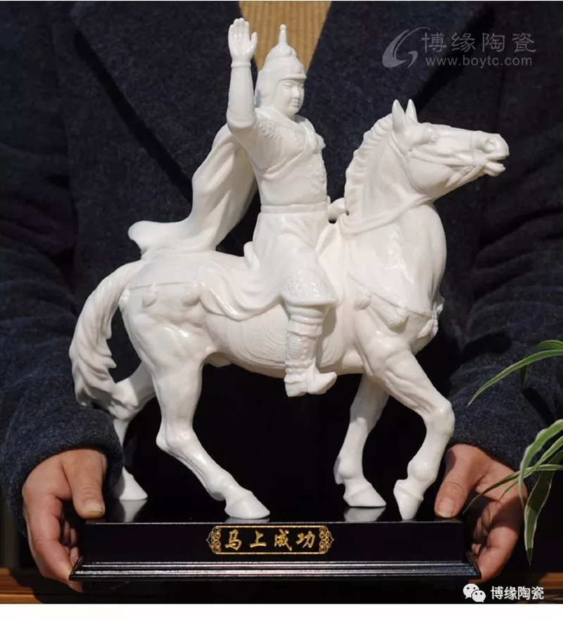 《馬上成功》作品由德化工藝美術(shù)大師制作,以德化特有溫潤如玉的“中國白”為胎質(zhì),手工制作,所塑人物威風(fēng)凜凜,英姿颯爽,形神兼?zhèn);所塑駿馬健碩勇猛,栩栩如生,尤如馬蹄聲陣陣,銀蛇騰空去,烈馬飛奔來。
