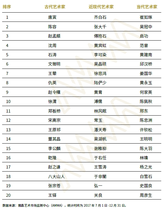 那么,2017年秋拍市場(chǎng)上,中國書畫各個(gè)板塊哪些畫家的拍品更受市場(chǎng)追捧?來看看畫家作品入圍各個(gè)板塊的TOP20情況: