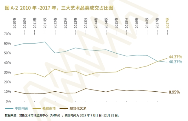 所以,從各板塊成交的走勢(shì)圖來看,瓷雜板塊拍品在成交上,上升趨勢(shì)明顯;而中國書畫板塊的成交占比,已連續(xù)三年下降。