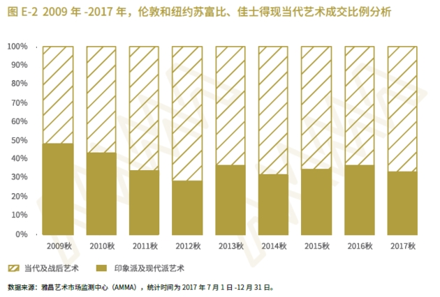 2017年秋拍,西方拍賣市場(chǎng)呈現(xiàn)回暖態(tài)勢(shì),秋季倫敦及紐約的佳士得、蘇富比的印象派及現(xiàn)代派藝術(shù)、當(dāng)代及戰(zhàn)后藝術(shù)市場(chǎng),表現(xiàn)突飛猛進(jìn),這兩個(gè)板塊成交額分別達(dá)8.81億美元、17.6億美元高價(jià),均達(dá)到近九年最高水平。