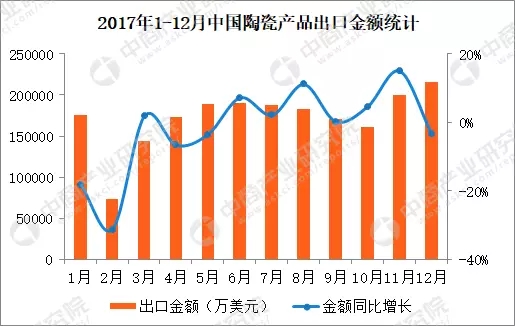 據(jù)中商產(chǎn)業(yè)研究院發(fā)布的《2018-2023年中國陶瓷產(chǎn)品市場前景及投資機會研究報告》數(shù)據(jù)統(tǒng)計顯示,2017年12月中國陶瓷產(chǎn)品出口金額2159649千美元,同比減少3.2%;1-12月,中國出口陶瓷產(chǎn)品金額19249612千美元,同比增長5.4%。