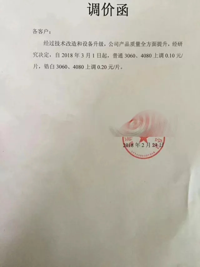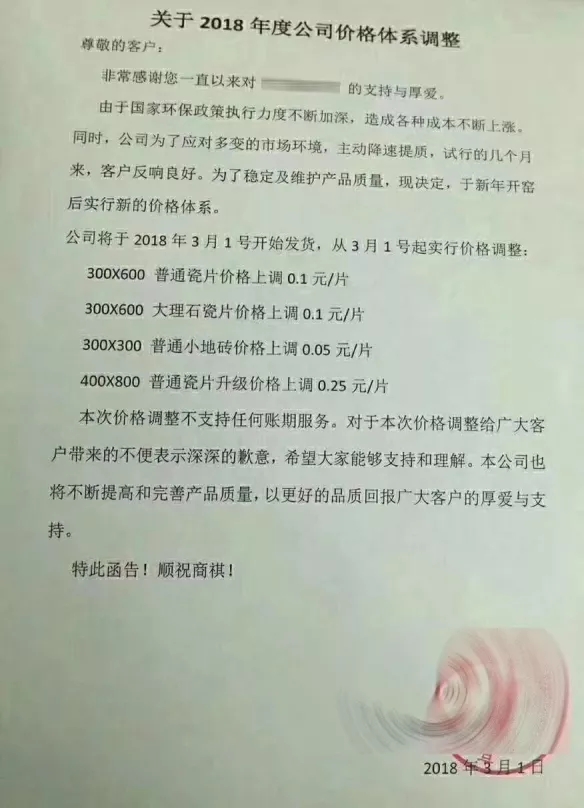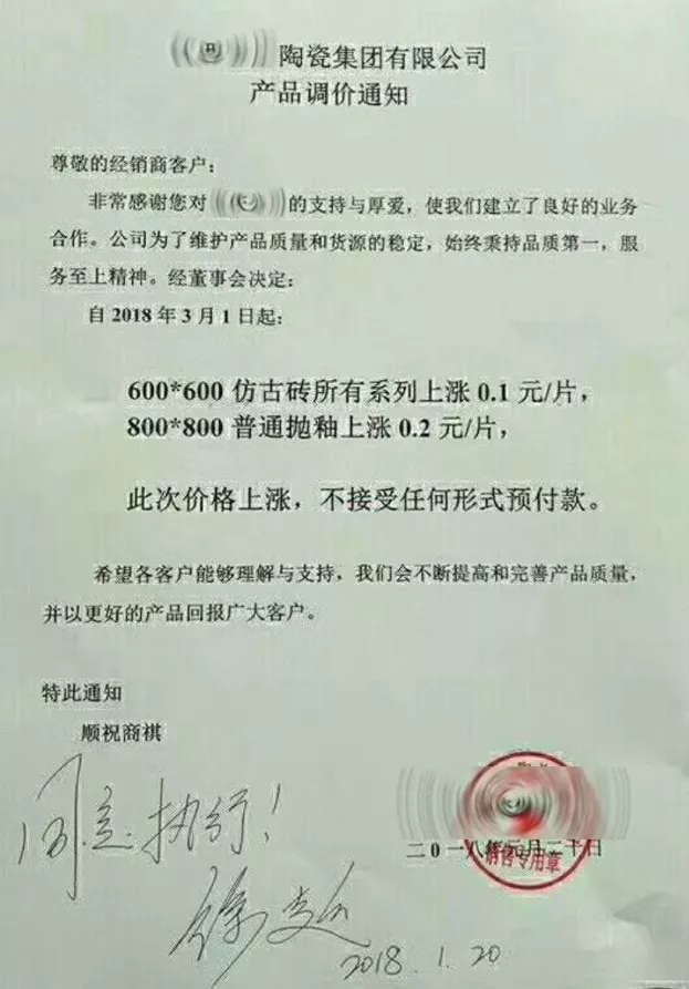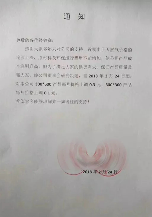春節(jié)后,包括山東臨沂、四川夾江、江西高安、山西陽城等產(chǎn)區(qū),已有不少廠家發(fā)出漲價(jià)通知,提出上調(diào)瓷磚價(jià)格。產(chǎn)品品類涉及拋光磚、拋釉磚、仿古磚等,不同規(guī)格、不同品類瓷磚產(chǎn)品價(jià)格上調(diào)幅度在0.1元/片到0.3元/片之間。陶sir了解到,江西產(chǎn)區(qū)由于2017年改線全拋釉較多,拋光磚產(chǎn)能減少,因此年后漲價(jià)較為順利,而全國(guó)拋釉磚由于產(chǎn)能過大,漲價(jià)較少,且幅度較小。