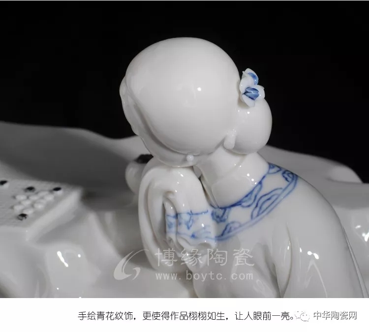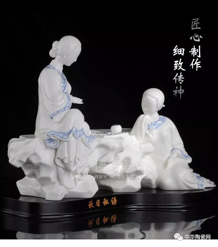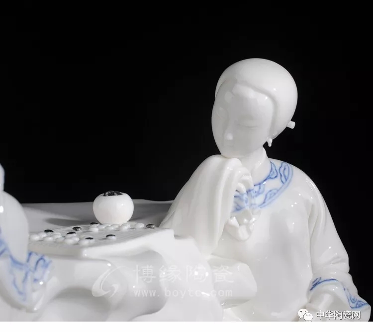 《秋日私語》作品采用德化傳統(tǒng)瓷雕技藝,把人物神態(tài)、衣紋細(xì)節(jié)、整體構(gòu)思,描繪的栩栩如生,一個(gè)手持棋子將落未落,又一人托住下巴,好似在思索,一動一靜的結(jié)合巧合天工,加之手繪青花紋飾,使得作品更加豐滿。