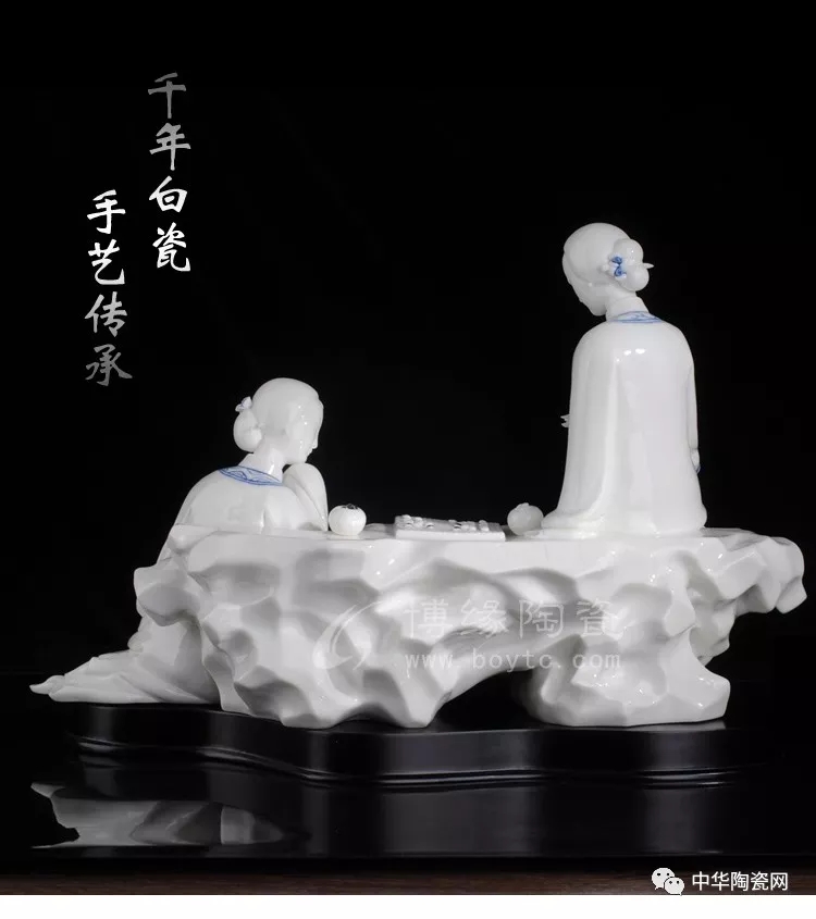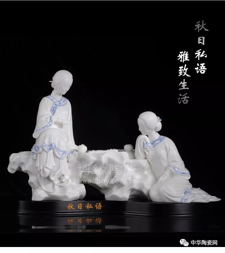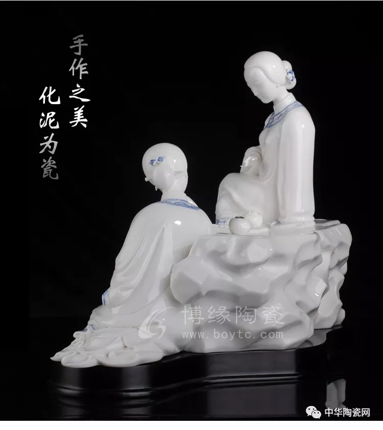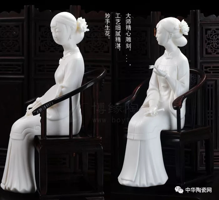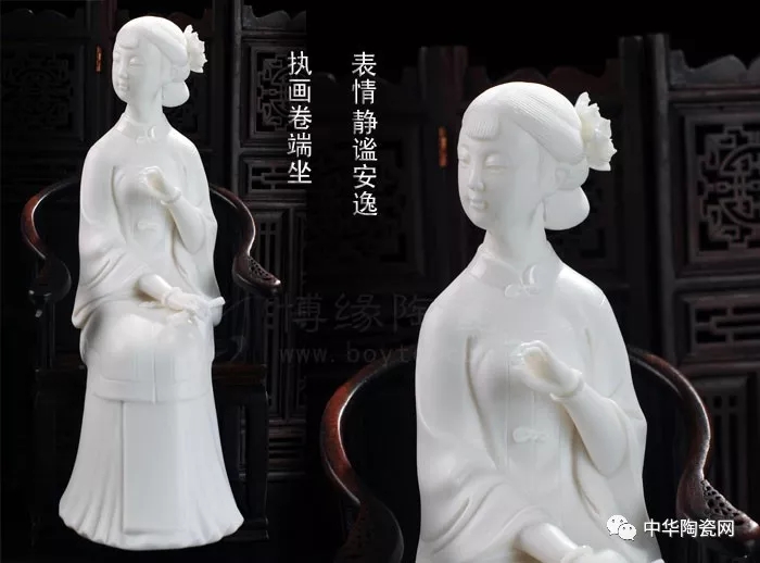 德化陶瓷作品創(chuàng)作題材豐富,其中仕女也是一大題材之一,自古以來,以四大美女、唐清仕女等人物創(chuàng)作的作品比比皆是。因德化白瓷細(xì)膩,可塑性強(qiáng),適合仕女作品創(chuàng)作,所創(chuàng)作品人物傳神,雕刻精細(xì)。