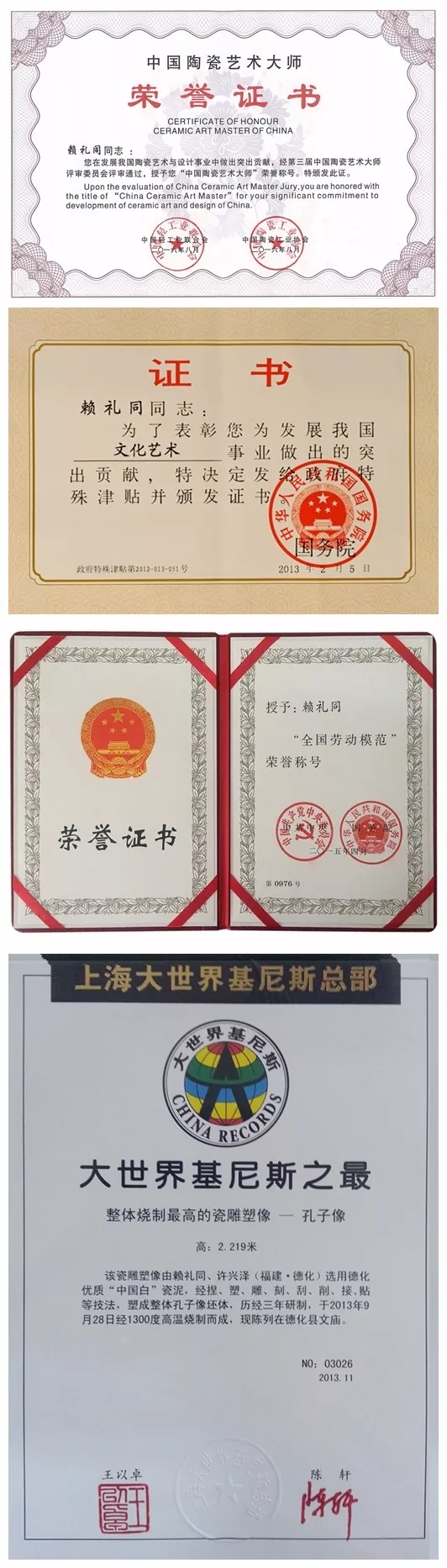 賴禮同,男,1968年3月出生,F(xiàn)任福建省德化縣博古陶瓷研究所藝術(shù)總監(jiān)!妒肆_漢》、《三十三觀音》、《福到眼前》等50多件作品在國(guó)家級(jí)、省級(jí)專業(yè)評(píng)比中獲金獎(jiǎng)。作品《吉祥花瓶》被故宮博物院收藏(全國(guó)現(xiàn)代陶瓷作品第一件被破例收藏),《托起半邊天》、《山鬼》、《富貴吉祥》《倚狢披坐提書(shū)觀音》四件作品被中國(guó)國(guó)家博物館收藏,《關(guān)公》《孔子像》等二十余件作品被首都博物館、三峽博物館、福建省珍品館、福建省博物館等收藏。整體燒制的瓷雕塑像《孔子像》高2、219米獲“大世界基尼斯之最”。