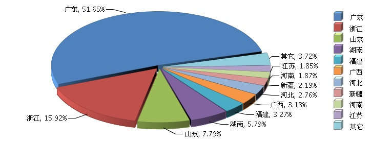 據(jù)海關(guān)數(shù)據(jù)顯示,2017年我國(guó)陶瓷餐具出口主要集中在廣東、浙江,兩省陶瓷餐具出口占我國(guó)陶瓷餐具出口總額的近70%,其中廣東完成累計(jì)出口額26.63億美元(同比增長(zhǎng)1.08%),占51.65%;浙江完成累計(jì)出口額8.21億美元(同比增長(zhǎng)-0.8%),占15.92%。從出口增速看,河南、江蘇兩省增速居前,其中河南同比增長(zhǎng)26.91%;江蘇同比增長(zhǎng)24.91%;出口前十地區(qū)中,僅新疆、河北、浙江同比下降,分別為-11.46%、-3.26%、-0.80%。