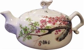 民國(guó)新粉彩梅花圖梨形茶壺(見(jiàn)圖),胎體輕薄潔白,釉面瑩潤(rùn)光潔;壺蓋為圓形,壺首為鳥(niǎo)形,蓋面四周寫(xiě)有“可以清心”四字墨書(shū);壺把設(shè)計(jì)成圈形枝干,顯得大氣、清新、自然、脫俗;壺嘴連接壺身處有扁形模印陽(yáng)文繁體雙面印,分別為“勝利”二字,以此推定,此壺為1945年后為紀(jì)念抗日戰(zhàn)爭(zhēng)勝利而制。茶壺中心畫(huà)面是一枝頗具書(shū)法金石意味的蒼勁紅梅,梅以寫(xiě)意彰顯俊俏,梅蕊以淡墨勾勒,紅梅、青梅枝繁花茂給人以迎風(fēng)撲朔之美。壺背書(shū)有“茶徑琴韻書(shū)聲”六字行書(shū)并有干支紀(jì)年款,壺上書(shū)法秀雅流暢,壺底有菱形印款依稀可辨“余□□”等字。