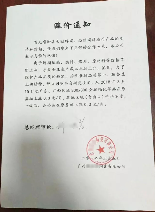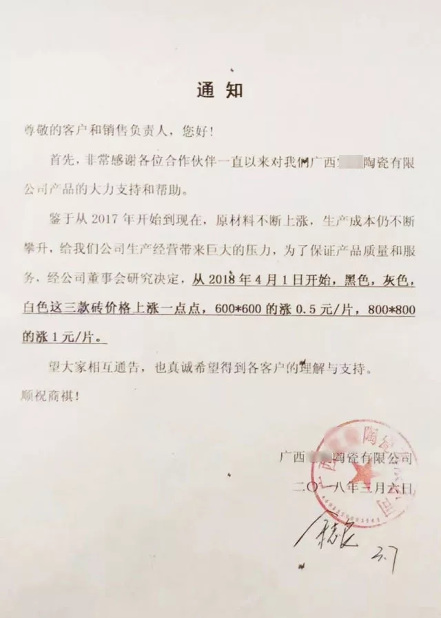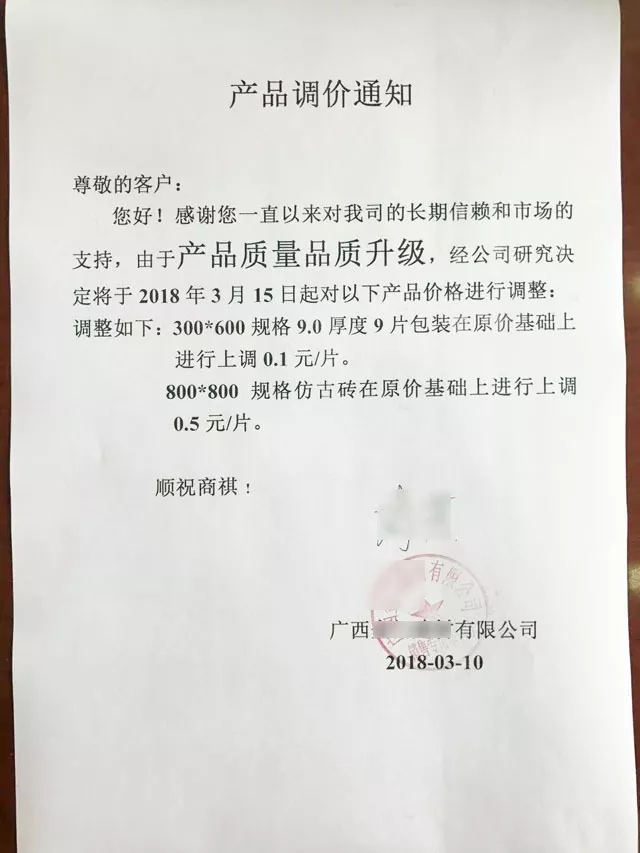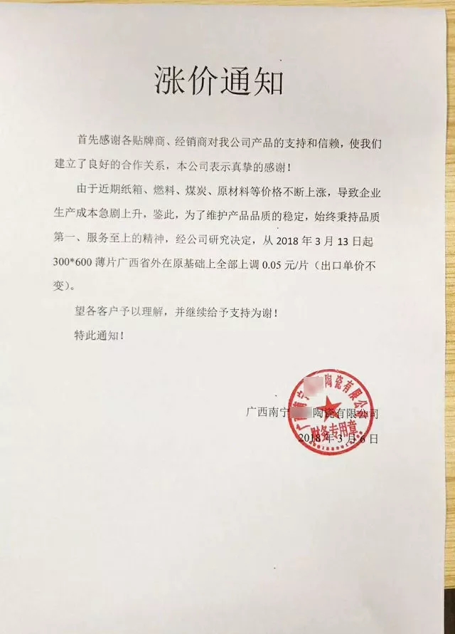 近日,廣西產(chǎn)區(qū),包括南寧、賀州、藤縣、桂平等地多家陶瓷生產(chǎn)企業(yè)均發(fā)出漲價(jià)通知,將在3月15日左右上調(diào)產(chǎn)品價(jià)格,涉及產(chǎn)品包括仿古磚、瓷片、外墻磚、拋光磚、全拋釉等。