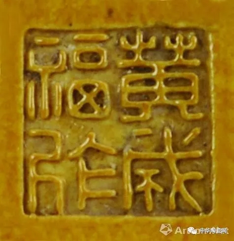 這件“黃戚福”款黃釉雕瓷松竹梅紋筆筒(圖1),高12.7、口徑7.9、底徑7.8厘米,是上世紀(jì)50年代安徽省博物館在合肥市征集入藏的一件雕瓷工藝精品,2002年出版的《安徽省博物館藏瓷》一書中就收錄有這件雕瓷筆筒。此筆筒平唇,直筒形,圈足,通體施黃釉,從造型到顏色都酷似竹雕筆筒。筒身一周刻松、竹、梅“歲寒三友”圖案,雕工精細(xì),以刻刀將瓷地剔除,以陽(yáng)紋的形式突出紋樣,表現(xiàn)了蒼松之挺拔、修竹之傲骨、臘梅之多姿,整個(gè)圖案渾然一體,典雅莊重,意境高遠(yuǎn)。而在筆筒的底部,還刻有“黃戚福作”四字陽(yáng)文篆書印章款(圖2)。從整體風(fēng)格來看,該筆筒應(yīng)為清代中后期作品。