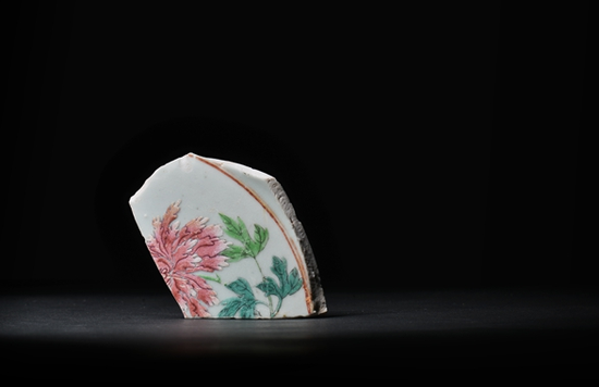 這塊瓷片上有很多值得關(guān)注的細節(jié):可以明顯看到畫面和色彩受到的磨損,因為所有的顏色都浮在釉的表面,并不受到釉層的保護,青花瓷就沒有這樣的危險;綠色顯得比較薄,而粉紅色花頭的部分則具有一定的厚度;綠色的葉子刻意使用了兩種不同的色調(diào),但每一種綠色只負責一片樹葉,而花頭則不同,可以看出粉紅色努力展現(xiàn)的細微變化,由深至淺或由淺至深,粉紅色最淡的地方,變成了白色;奇怪的是,瓷器本來就是白的,而花頭的白色卻又是堆在瓷器表面的一層,帶有厚度,質(zhì)感上也與瓷器的白色很不同。
