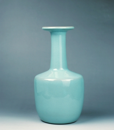 朱文立逐漸摸索出一整套汝瓷選材、制材、燒制、成瓷等技藝?yán)碚摵凸に圀w系,推出了一系列天青釉汝瓷藝術(shù)作品,如弦紋瓶、百合瓶、迎春瓶、花觚等,這些作品造型不一,但都釉體流暢,別致雅觀,既有北宋汝官瓷的韻致,又帶有明顯的朱氏風(fēng)格。其得意之作如意尊,造型古樸,簡潔素雅,憨態(tài)可掬,沒有多余的紋飾細(xì)描,但又于輕巧中現(xiàn)端莊,于明雅中見深沉肅穆。其小巧之作如荷花碗,碗口曲線形似流水,宛如荷花綻放,自由舒展,似在輕風(fēng)中搖曳。按常理,他已功成名就,完全可以像其他陶瓷藝術(shù)家一樣,專注于把“朱氏汝瓷”推向市場。況且,他已經(jīng)失業(yè)了,小女兒才兩歲,全家僅靠他愛人微薄的工資度日。但朱文立心中已經(jīng)有了自己的奮斗方向,隨著對汝瓷研究的深入,他對汝官窯址是不是在清涼寺產(chǎn)生了疑慮。