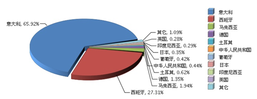 從進口增速看,進口額前十的國家中,來自土耳其、意大利、西班牙、馬來西亞、葡萄牙、印度尼西亞的進口額大幅增長,增速分別為357.68%、46.92%、43.94%、36.27%、30.84%、28.25%(表1),其中土耳其由上年進口額前十之外升至第五。