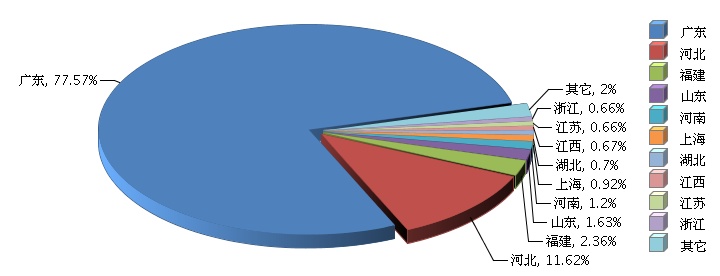 據(jù)海關(guān)數(shù)據(jù)顯示,2017年全國陶瓷制固定衛(wèi)生設(shè)備累計(jì)出口額比重主要集中在廣東、河北、福建、山東、河南、上海、湖北、江西、江蘇、浙江等地區(qū)。其中:廣東完成累計(jì)出口額33億美元(占77.57%),同比增長52.4%,出口額及增速均居首位。