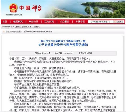 3月23日0時(shí),河北邢臺(tái)啟動(dòng)重污染天氣橙色預(yù)警,在執(zhí)行《2018年3月份大氣污染綜合治理攻堅(jiān)月行動(dòng)方案》的基礎(chǔ)上,按照《邢臺(tái)市重污染天氣應(yīng)急預(yù)案》及補(bǔ)充說明實(shí)施Ⅱ級(jí)應(yīng)急響應(yīng)措施。